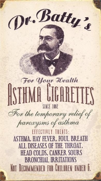 Using cigarettes to treat asthma (WTF?). Not recommended for children under age 6, but age 7 & up can smoke away! Posted on November 25, 2012 by Matthew 0 Share this: Click to share on Facebook (Opens in new window) Facebook Click to share on X (Opens in new window) X Like Loading... Related