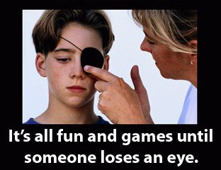 It’s all fun and games till someone pokes an eye out Posted on January 19, 2013 by Matthew 0 Share this: Share on Facebook (Opens in new window) Facebook Share on X (Opens in new window) X Like Loading... Related