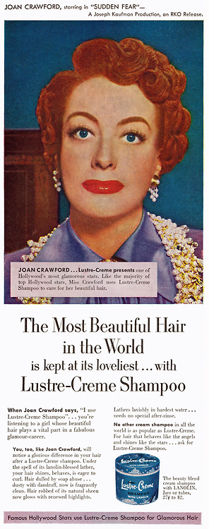 Joan Crawford in an ad for Lustre-Creme Shampoo Posted on July 20, 2013 by Matthew 0 Share this: Click to share on Facebook (Opens in new window) Facebook Click to share on X (Opens in new window) X Like Loading... Related
