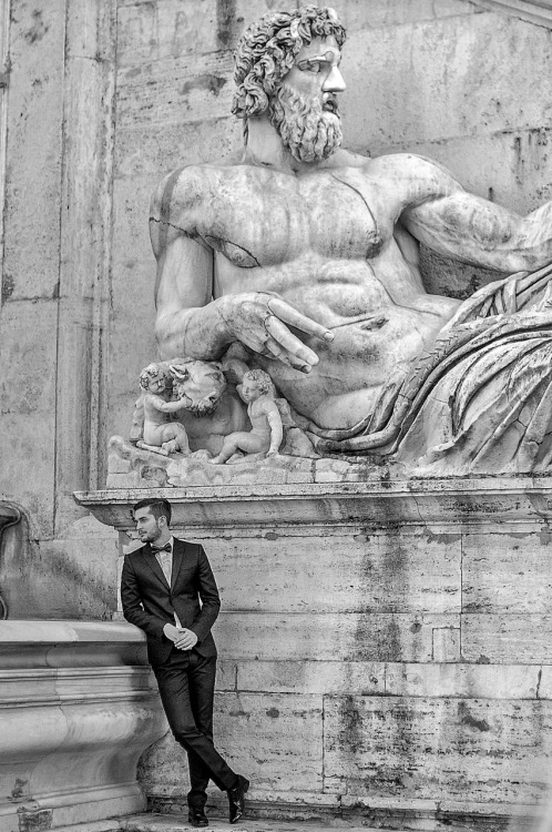 Well dressed man by a bearded statue