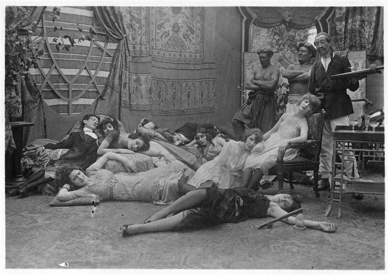 georges-remonds-movie-dandy-pacha-1920 Published December 9, 2016 at 758 × 537 in Opium smokers (attended by eunuchs) in Georges Rémond’s silent movie “Dandy-Pacha”, 1920