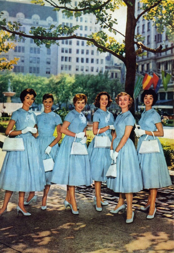 One thought on “Women in blue dresses (wedding party?), NYC, 1950s