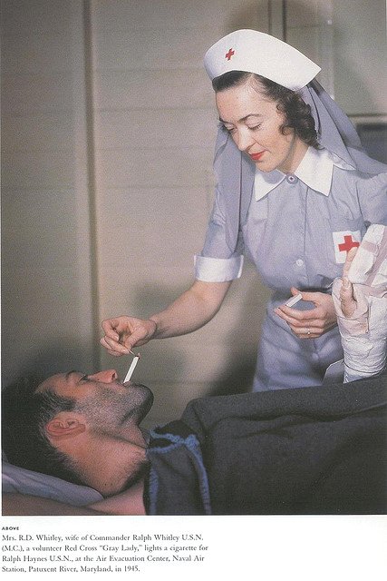 WWII INJURED SOLDIER Published February 25, 2019 at 427 × 640 in Red Cross volunteer lighting a cigarette for an injured sailor, WWII