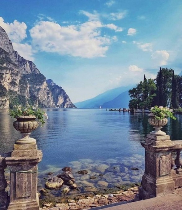 Flower urns by the water