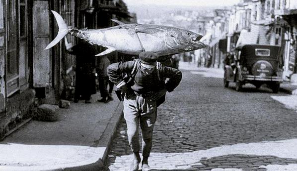 TURKEY ISTANBUL TUNA Published May 18, 2019 at 598 × 346 in Fisherman carrying a large tuna on his back through the streets of Istanbul, Turkey, 1930s