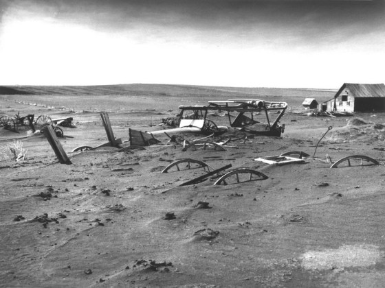 The Dust Bowl happened for around 10 years in the 1930s – vast areas of the middle part of the US dried up in a severe drought and, along with unsustainable agricultural & cattle raising practices and strong winds, created parched ground and that blew around in big dust storms. Before that the region was mostly privately owned small to large family farms and ranches. Many people left – hightailing it to California as well as the East Coast because of the inability to make a living off the land anymore and the dire effects of the Great Depression. Afterwards, many of the mostly abandoned areas were bought up and consolidated into large, highly irrigated corporate farms and concentrated cattle ranches, a system that exists to today.